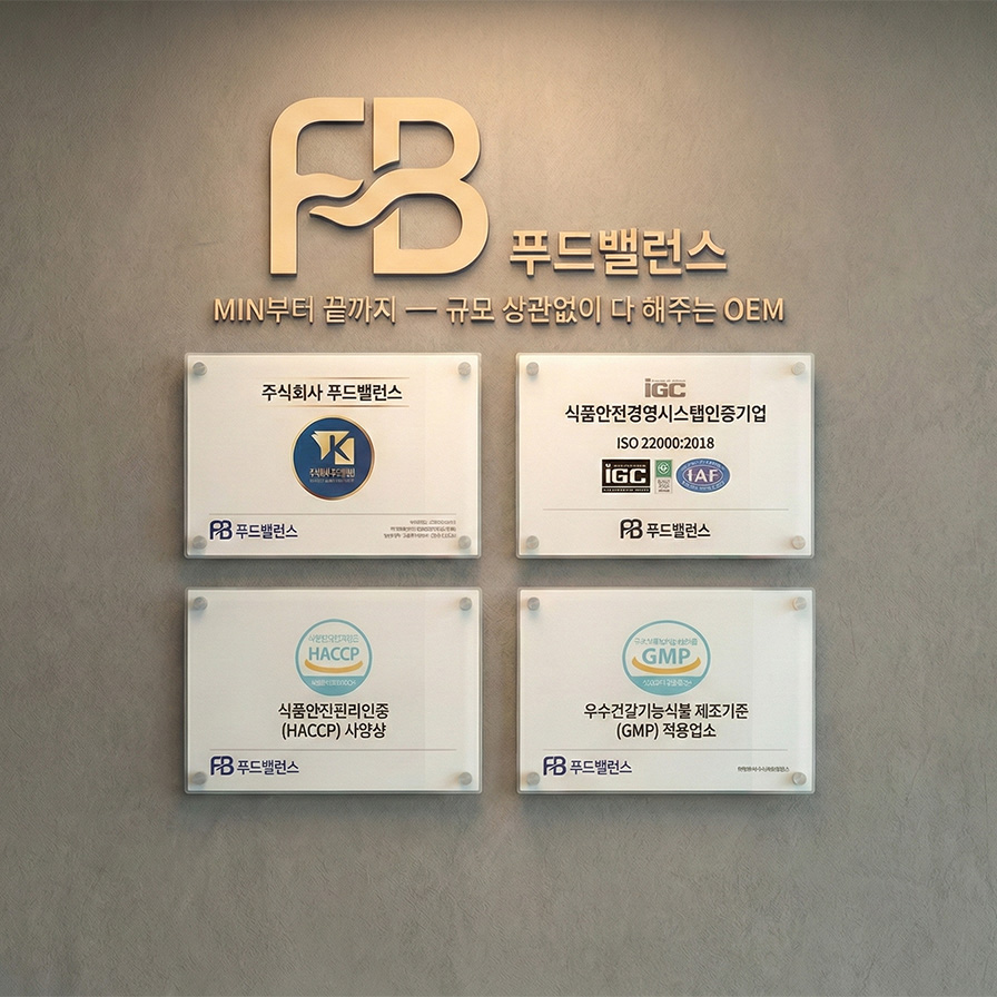 푸드밸런스는 건강기능식품 및 영양제 전문 OEM·ODM 기업으로서, 제품 기획부터 디자인, 제작까지 한 번에 해결하는 올인원 프로세스를 제공합니다. GMP 및 HACCP 인증 시설을 통한 철저한 품질 관리와 더불어, 다품종 소량 생산 시스템을 구축하여 고객사의 비즈니스 효율을 극대화하고 있습니다. 또한 신속한 원료 수급과 최신 트렌드를 반영한 명쾌한 컨설팅을 통해 시장 변화에 발 빠르게 대응할 수 있도록 돕습니다. 전문성과 신뢰를 바탕으로 고객님의 성공적인 비즈니스를 지원하는 든든한 파트너가 되어 드리겠습니다.
